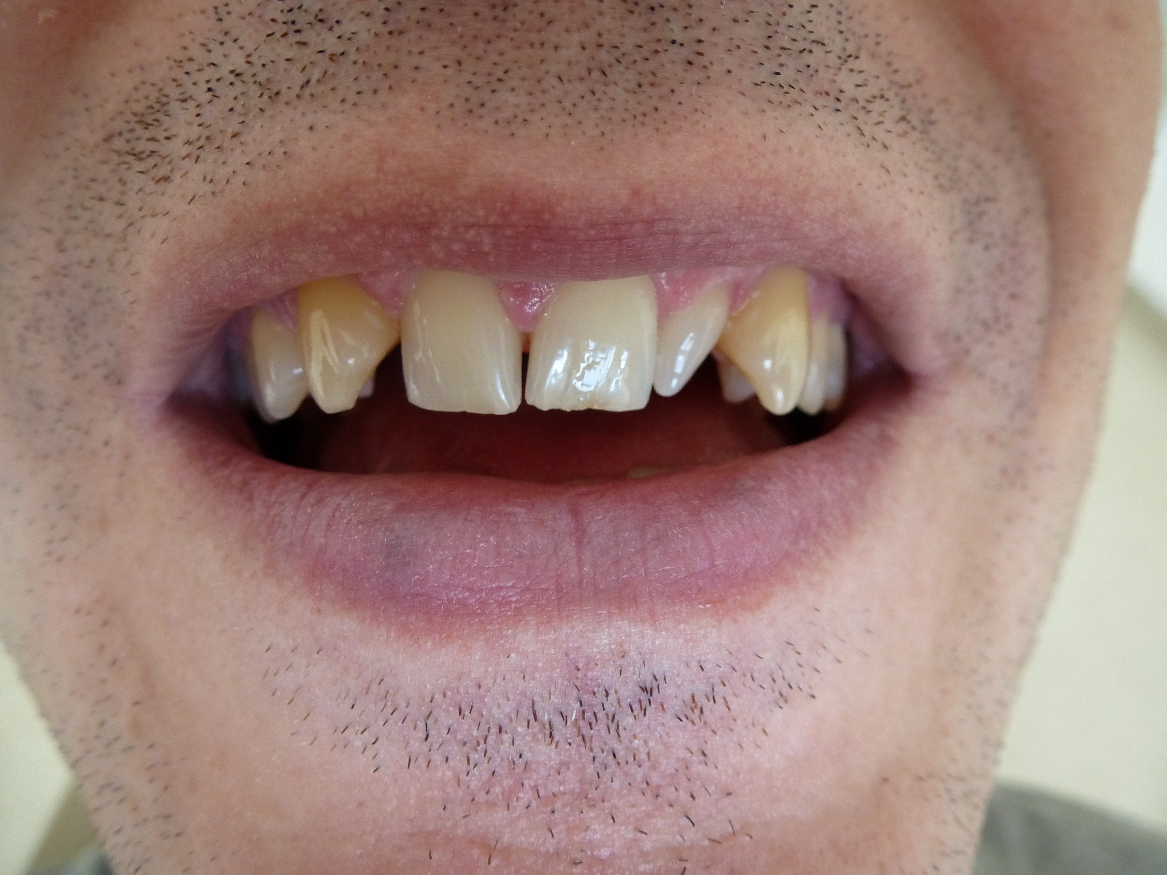 38 éves férfi páciensem már sok éve gondolkozott rajta, hogy a felső front fogait rendbe hozná, a fogak formáját harmonizálná, a fogívét pedig egységesítené. Fogorvosi szempontból az okozta a nehézséget, hogy hiányzott a jobb felső oldalsó metszőfoga, a nagymetsző mellett közvetlenül a fogívből kilógó, nagyméretű szemfog állt. Így a megszokott 6 frontfog helyett neki eggyel kevesebb volt. A harmónikus felső fogsorhoz így a jobb oldali szemfogat át kellett alakítanunk metszőfog formájúra, a mögötte lévő kisőrlő pedig a szemfog lett. 6 darab préskerámia koronával állítottuk sikeresen helyre a szabálytalan felső fogsort, a végeredmény találkozott a páciensünk elvárásaival.